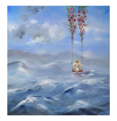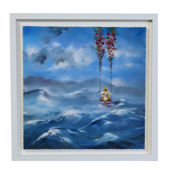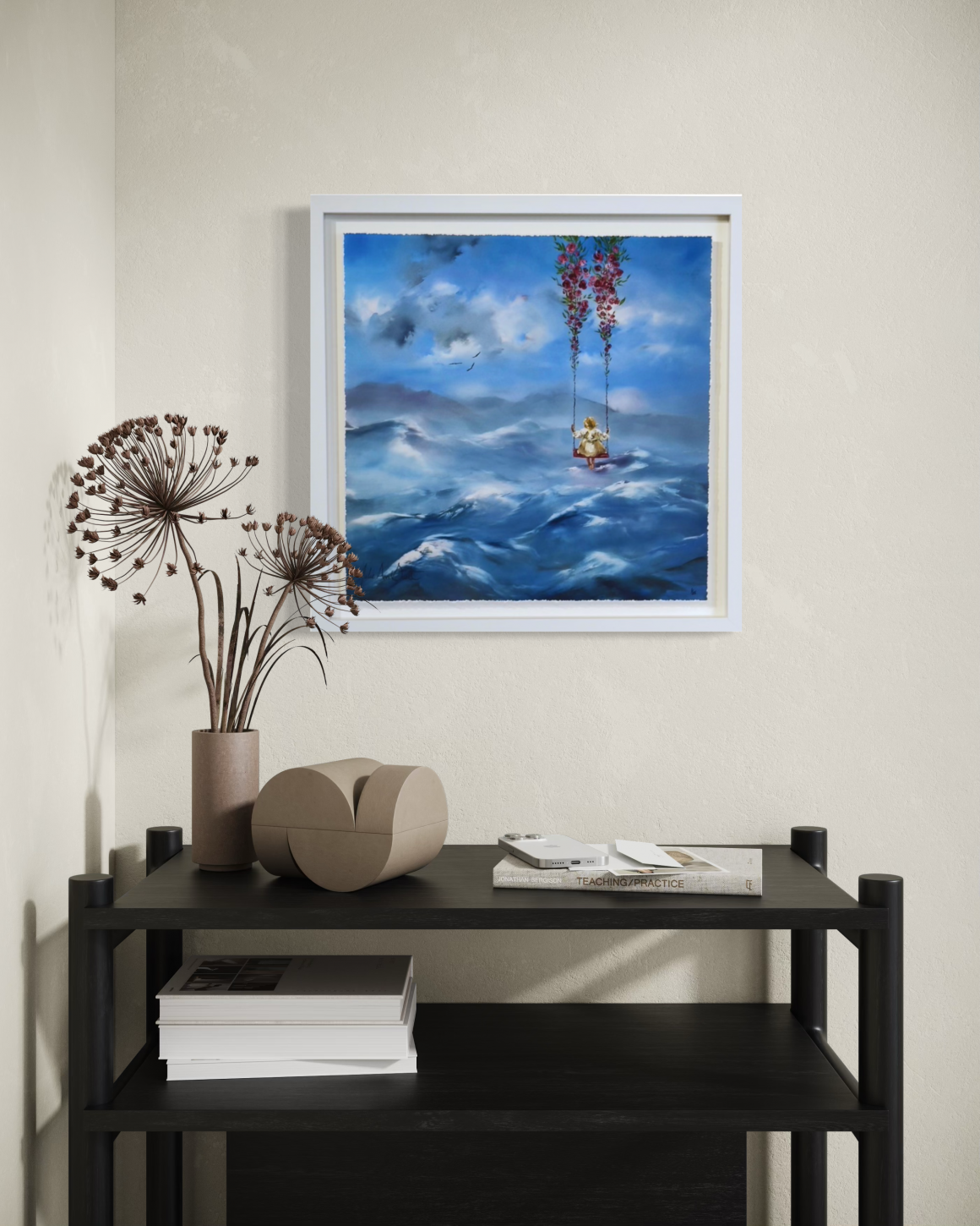 "From Above" transports the viewer into a whimsical, celestial realm. This captivating piece features a young girl on a floral-adorned swing, suspended high above a sea of rolling clouds or mountain peaks. The ethereal blue palette and the delicate details of the roses create a sense of peace, wonder, and boundless freedom. Finished with a hand-torn deckled edge, this print emphasizes the organic, artisanal quality of the medium, making it a standout addition to any collection.